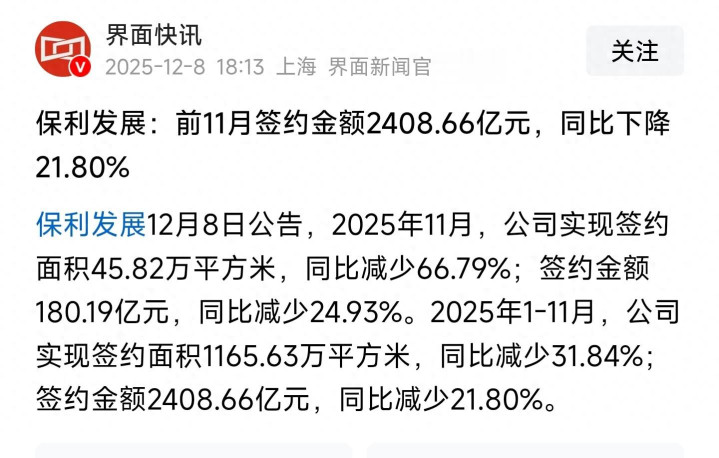 如上图所示,我们可以清楚的看到保利发展在今年的1~11月份,签约金额就达到了2408.66亿元,但是却同比下降了21.8%。