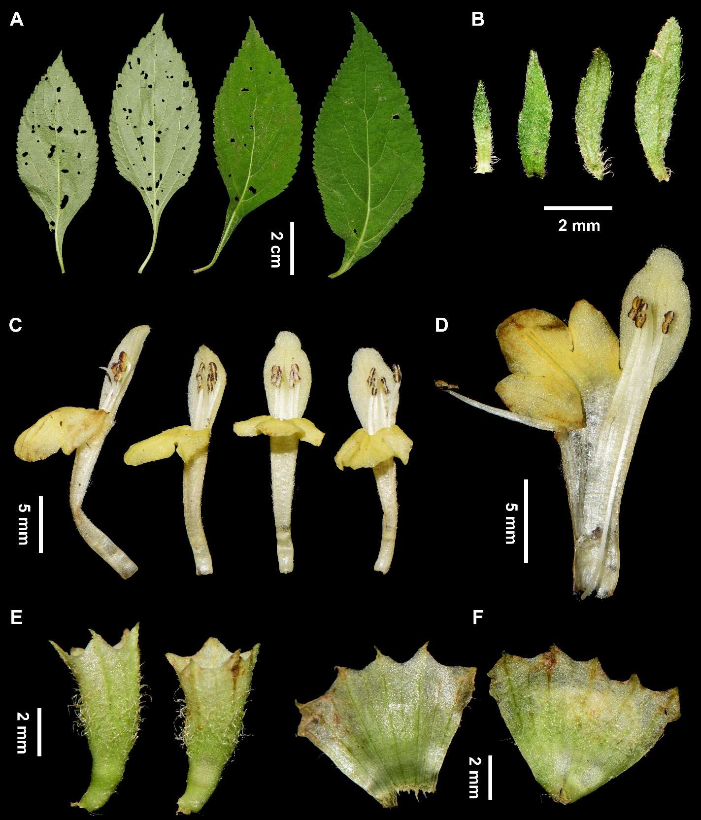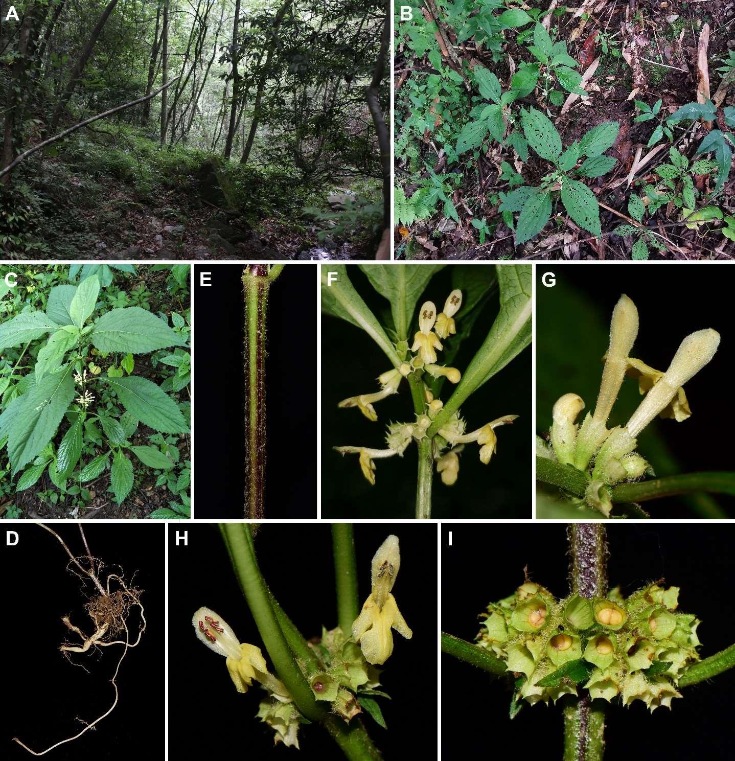 大巴山假糙苏主要生于900-1600米的山地林下。其主要鉴别特征为茎四棱形,密被或疏被倒向糙伏毛;叶片背面疏生腺点;聚伞圆锥花序球形;小苞片宿存且两面疏生糙伏毛;花萼外面密被绒毛;花冠黄色,花冠筒外表面密被短柔毛。